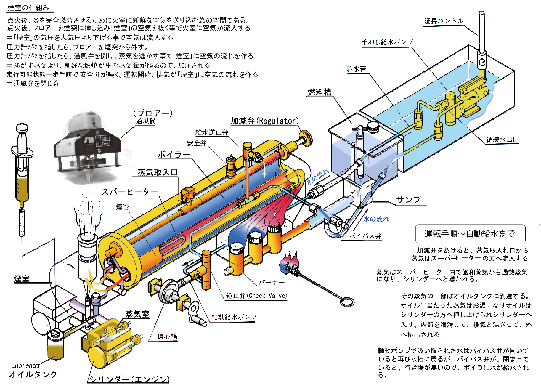 - 煙室の気密及び通風バルブ口の位置を確認します。煙室はCタイプや併用、ロコタイプのボイラーなどの燃焼に通風を要するボイラーの場合は、特に煙室部分の密閉、及び通風バルブが絶対に煙突の真下に、即ち通風ノズルの先は必ず煙突のセンターに位置していなければなりません。ペチコートの部分や煙室内壁を指していると、煙室内で空気がぐるぐる回り意味がありません。正しく通風が効く事で煙室の気圧が下がり、火室から煙室へ空気が引かれ(通風され)炎が完全燃焼するという理屈を覚えてください。
