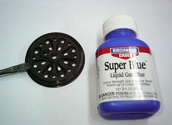 環境問題等に対応する為、弊社のメッキは三価クロームメッキを採用しております。これは六価クロームメッキより耐食性が弱い為、メンテナンスや、気候・環境等の問題で、赤錆を表面に生じさせる場合があります。これを修正する場合は、塗装ではなく、銃砲を黒染めする溶液(写真参照)を模型店で購入し対応してください。