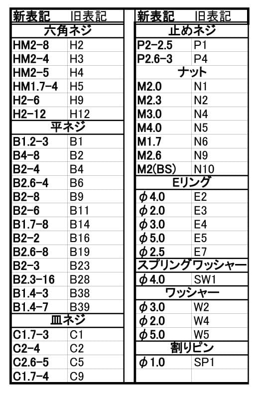 新旧ネジナット類対照表